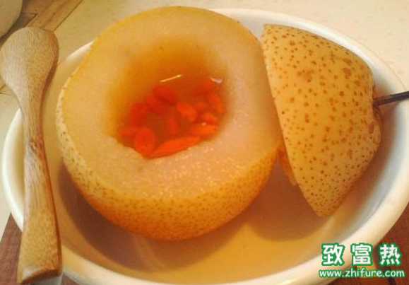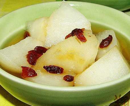 食材:多晶冰糖,梨2只,枸杞或红枣,水,尽量选汁多皮薄的那种梨,将梨且成小块,不要太小,否则易炖烂;冰糖用多晶的,不要单晶的。单晶的呈半透明、纯白色小方粒;而多晶的是像水晶一样形状不规则的微黄块状。平时买糖也最好选那种微黄的。 将枸杞或红枣洗净,如果是那种很干的大红枣,建议先稍泡发。在锅里放入适当的冷水,快烧开时加入适量冰糖;继续小火加热,稍后加入备好的梨,继续小火慢炖,约20-40分钟关火即可;中途可加入枸杞或红枣;倒出放在一旁待凉了再喝