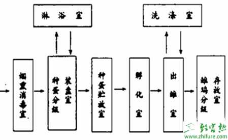 孵化场是由种蛋贮放室、种蛋分级装盘室、孵化室、出雏室、雏鸡分级存放室及日常所必需的其他房室等几部分组成,其主要操作流程如下图所示。