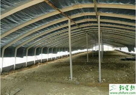 钢管主架固定后,搭建棚顶从内到外依次为橡胶泡沫、厚密度农膜、草苫、薄膜和遮阳网,共5层;棚外60cm处四周开宽40cm、深30cm的沟,挖出的土用以填高棚内地面,使之呈坡形并压实;棚内中间也开一宽40cm×深25cm的沟,上面最好装自动饮水器;顶部南面开二个天窗(60cm×70cm),用木条撑开和关闭;大棚四周围以厚密度农膜,农膜自下往上可卷起通风,可开启高度1.7m。